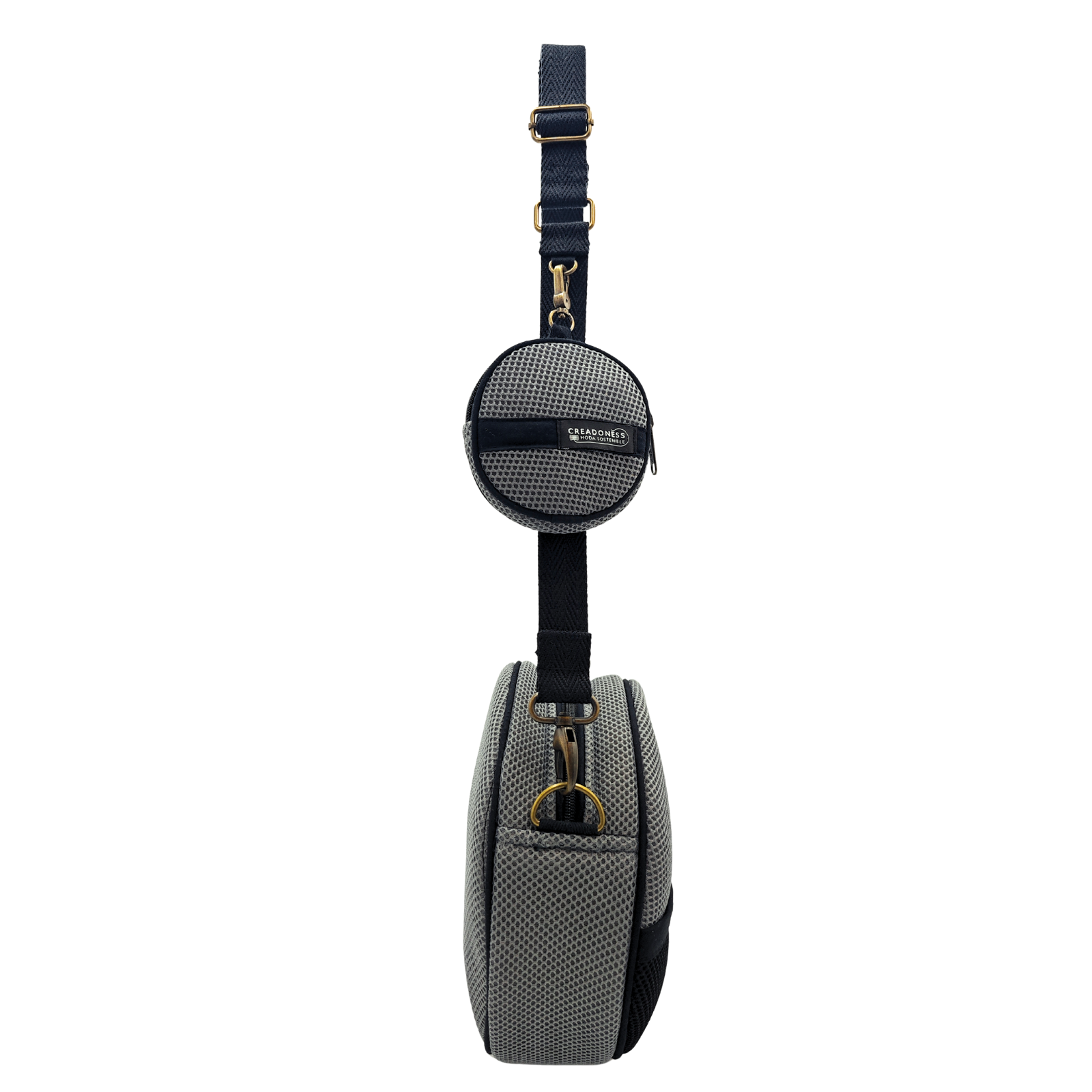 Este Bolso Circular está hecho a mano por mujeres que nosotras formamos en el Programa Social de Creadoness. Es un producto confeccionado con tejido técnico 3D y en su interior está forrado con loneta impermeable reciclada.