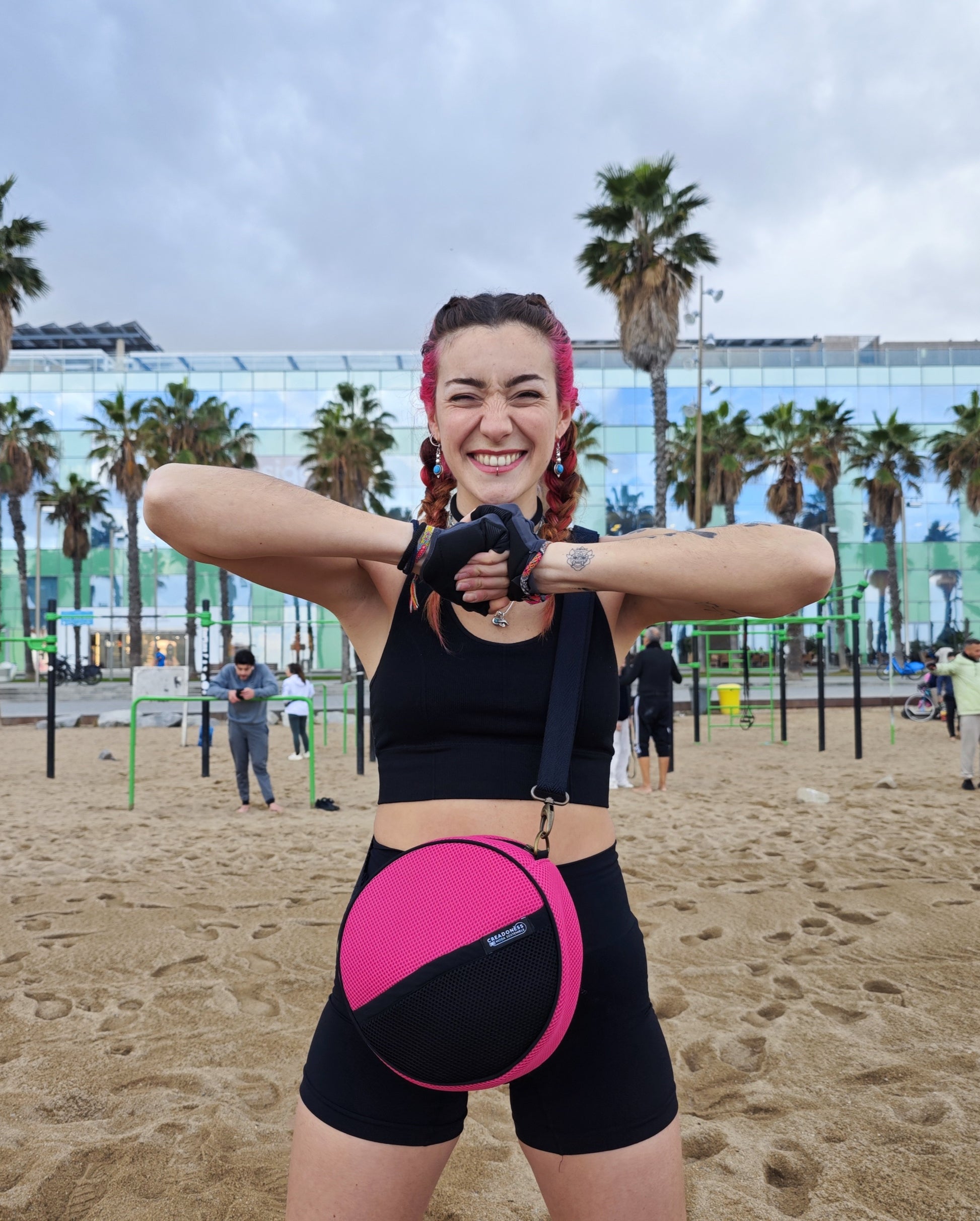 Este Bolso Circular está hecho a mano por mujeres que nosotras formamos en el Programa Social de Creadoness. Es un producto confeccionado con tejido técnico 3D y en su interior está forrado con loneta impermeable reciclada.