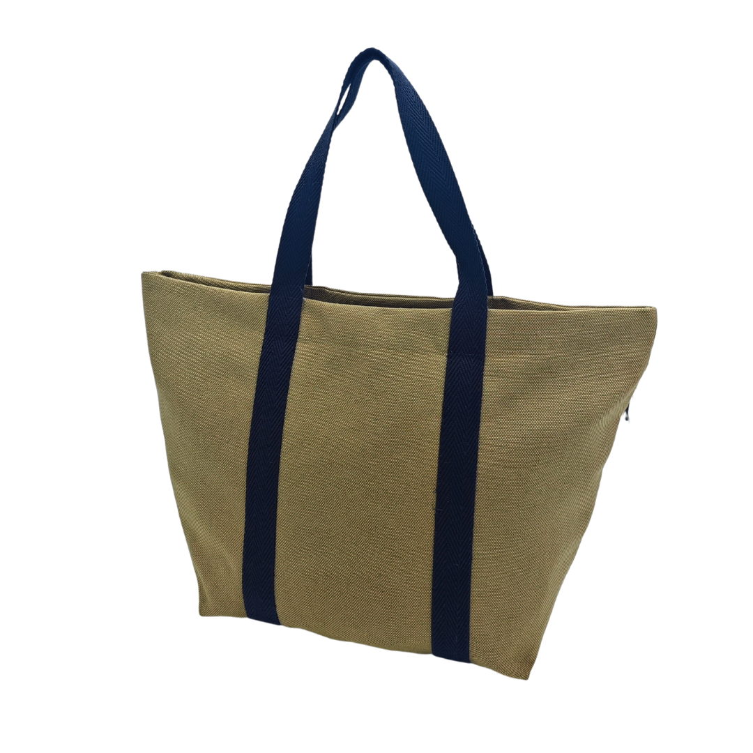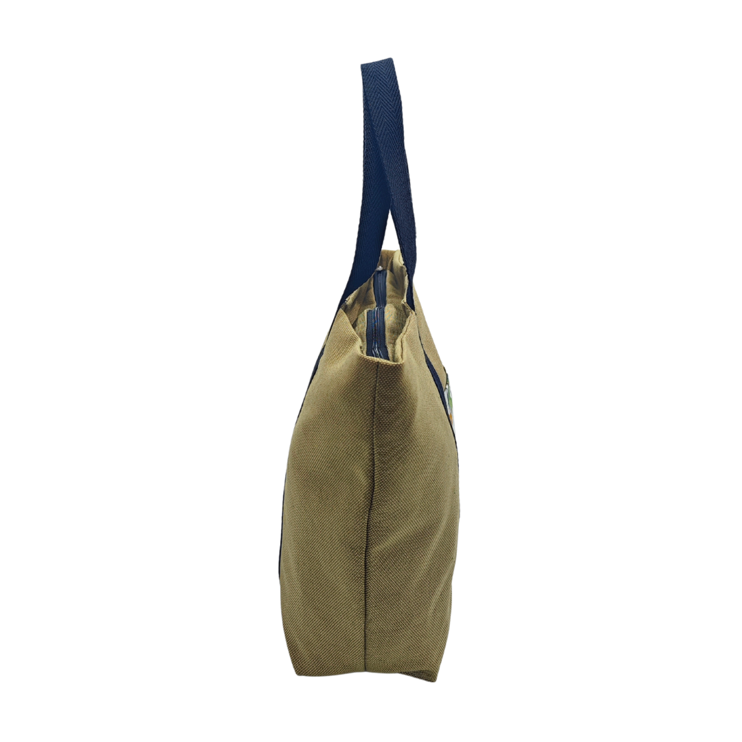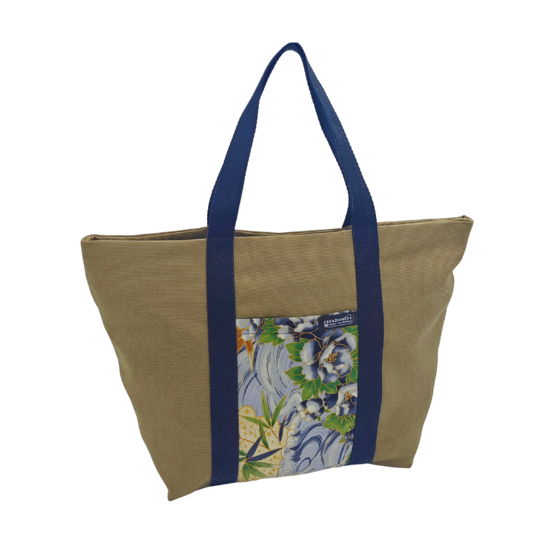La medida es de 48 x 34 cm. Profundidad de 9 cm. Posee 2 asas de algodón de cinta de espiga de 4 cm de ancho. Bolsillo exterior 15 x 33 cm. Bolsillo interior de 20 cm de profundidad. Por su profundidad tiene una gran utilización del espacio. Por el interior está todo forrado con tela de algodón blanco. Posee cremallera. En el frente tiene otro bolsillo de 15 cm para guardar tu botella de agua.