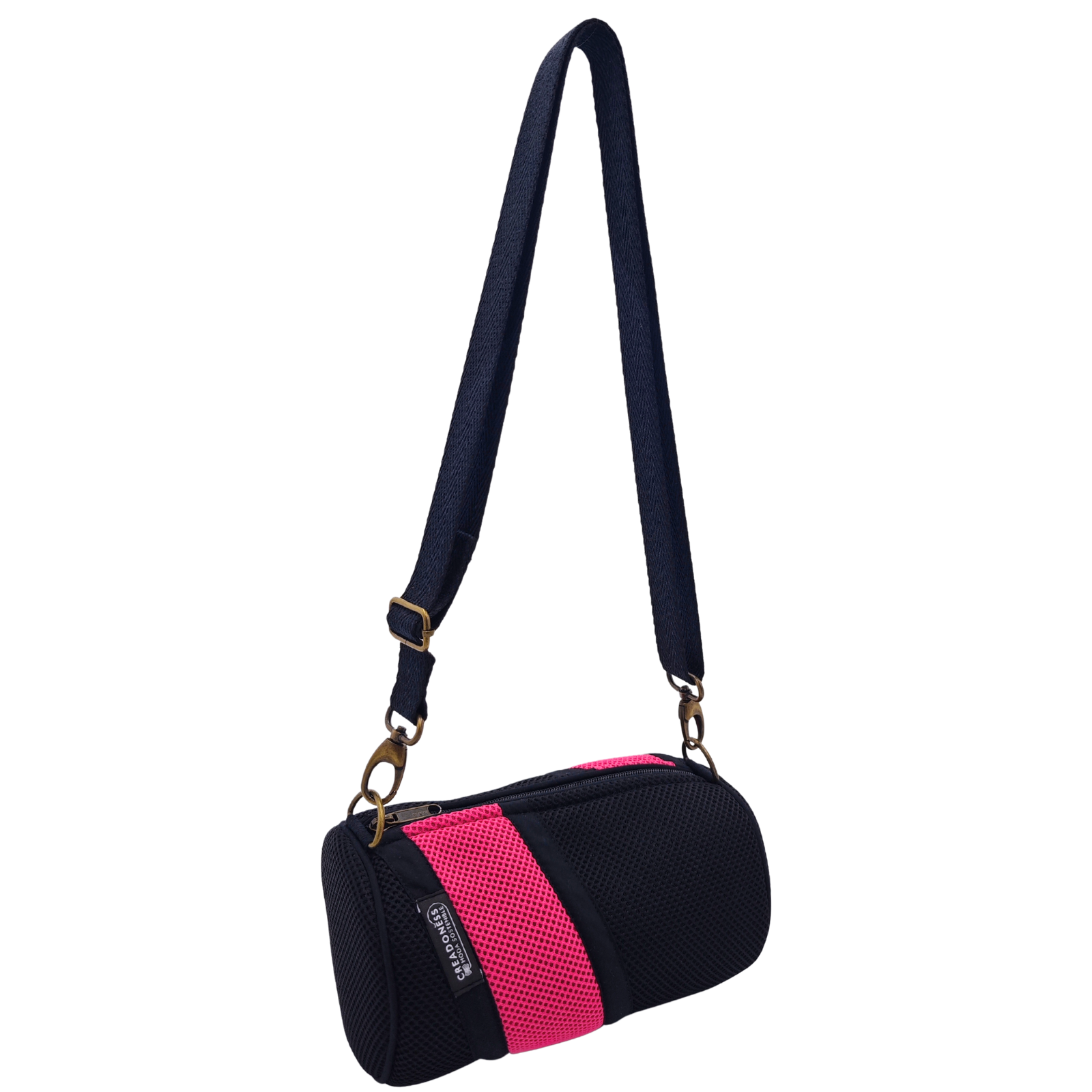 Este Mini Bolso está hecho a mano en Barcelona, confeccionado por mujeres formadas en nuestro programa social. La composición de materiales: en el exterior está compuesto por tejido técnico 3D y en su interior está forrado con tela negra vinílica impermeable reciclada. No posee bolsillo interior.
