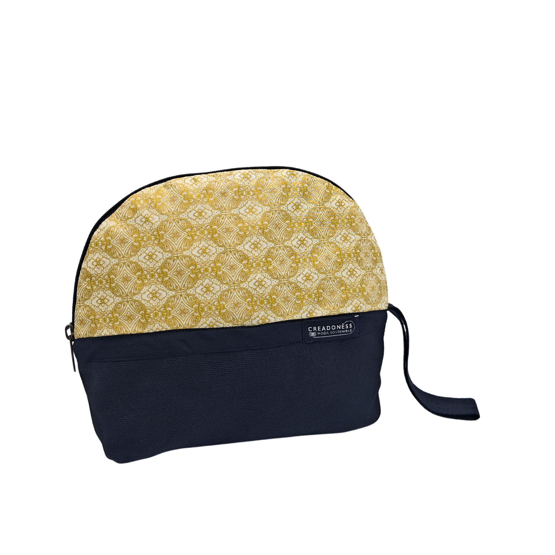 Este neceser grande está hecho a mano por las mujeres que nosotras formamos en el Programa Social de Creadoness. Está confeccionada con una suave loneta de algodón bicolor, con la característica de ser antimanchas. En su interior esta forrado con popelin negro.
