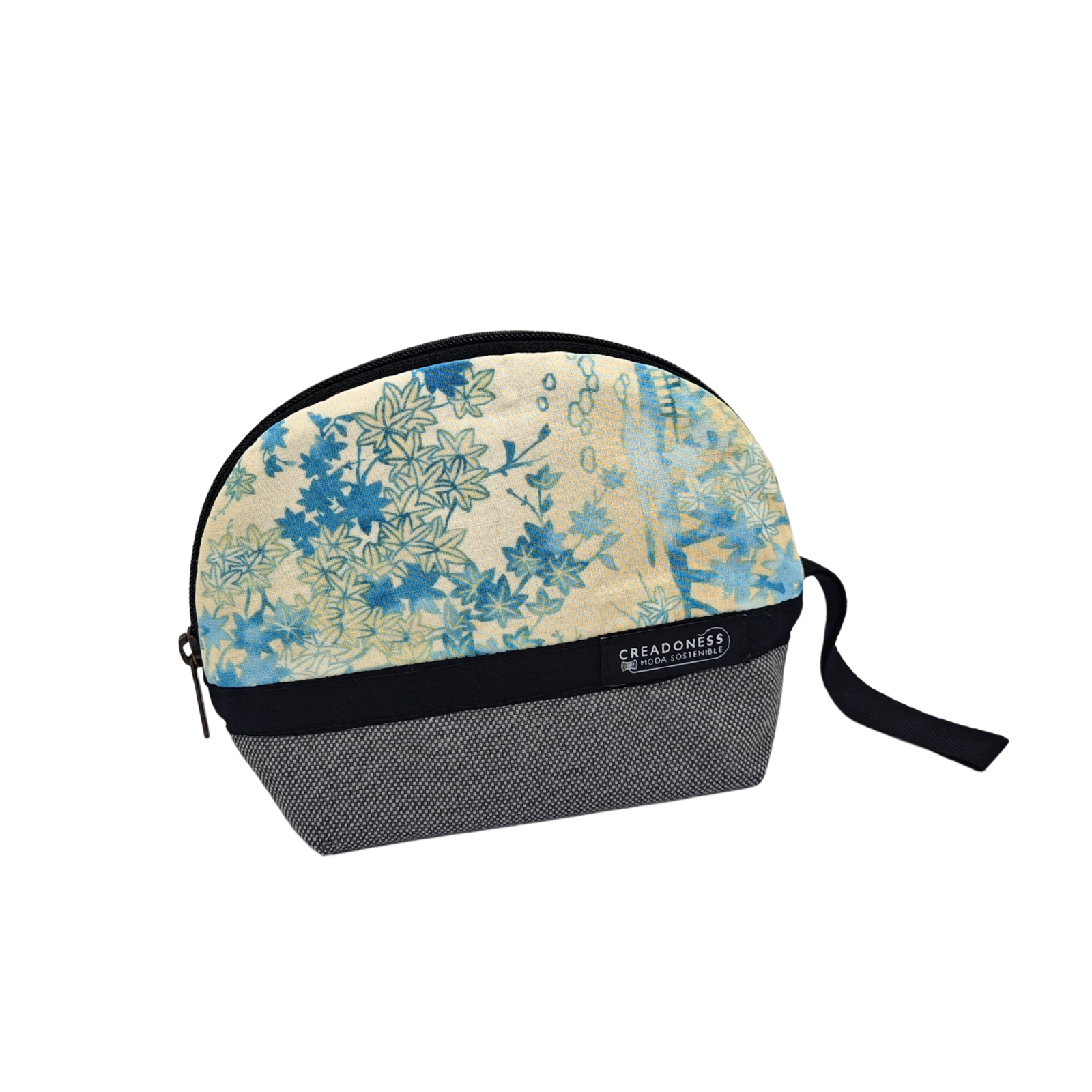 Este neceser pequeño está hecho a mano por las mujeres que nosotras formamos en el Programa Social de Creadoness. Está confeccionada con una suave loneta de algodón bicolor, con la característica de ser antimanchas. En su interior está forrado con popelín negro.