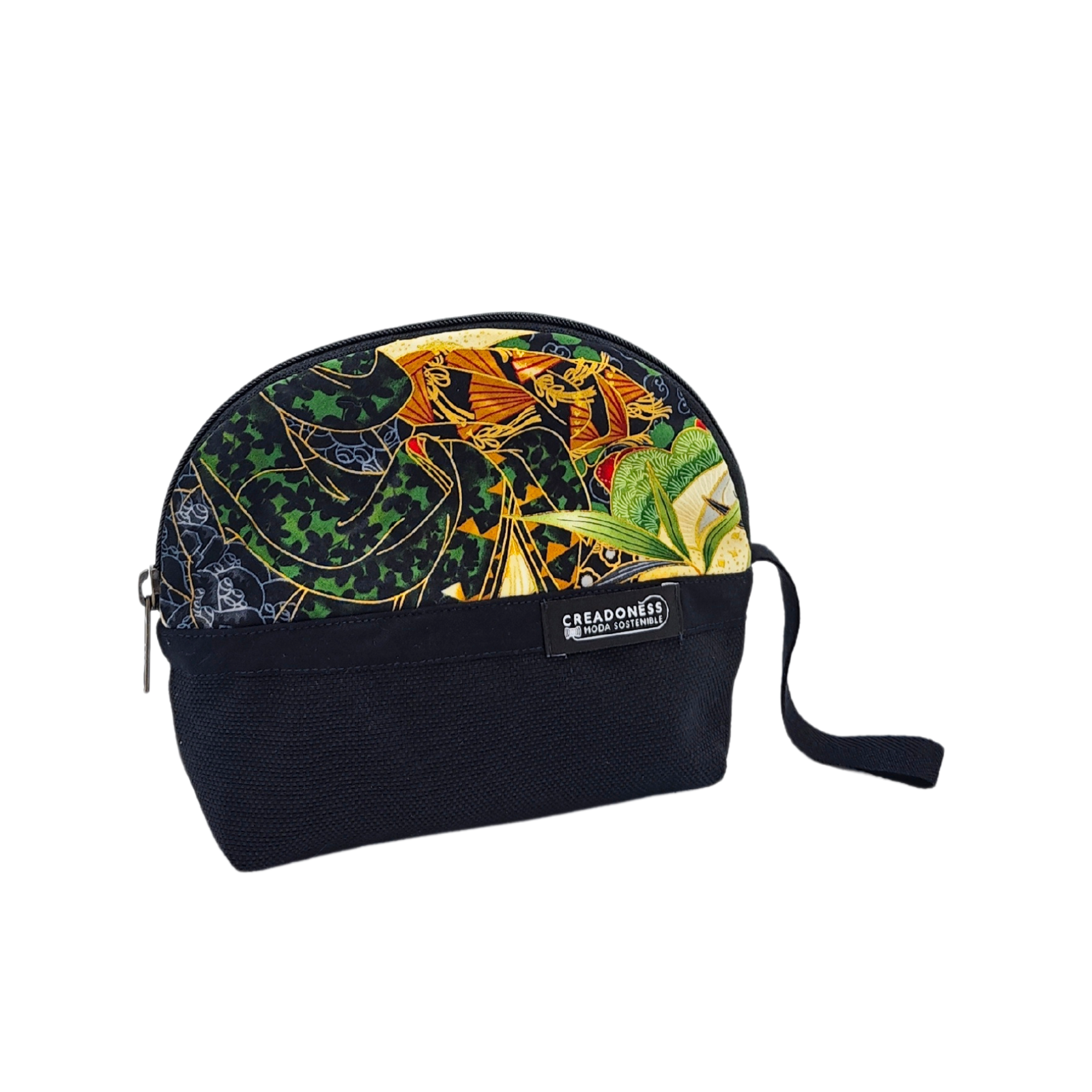 Este neceser pequeño está hecho a mano por las mujeres que nosotras formamos en el Programa Social de Creadoness. Está confeccionada con una suave loneta de algodón bicolor, con la característica de ser antimanchas. En su interior esta forrado con popelin negro.