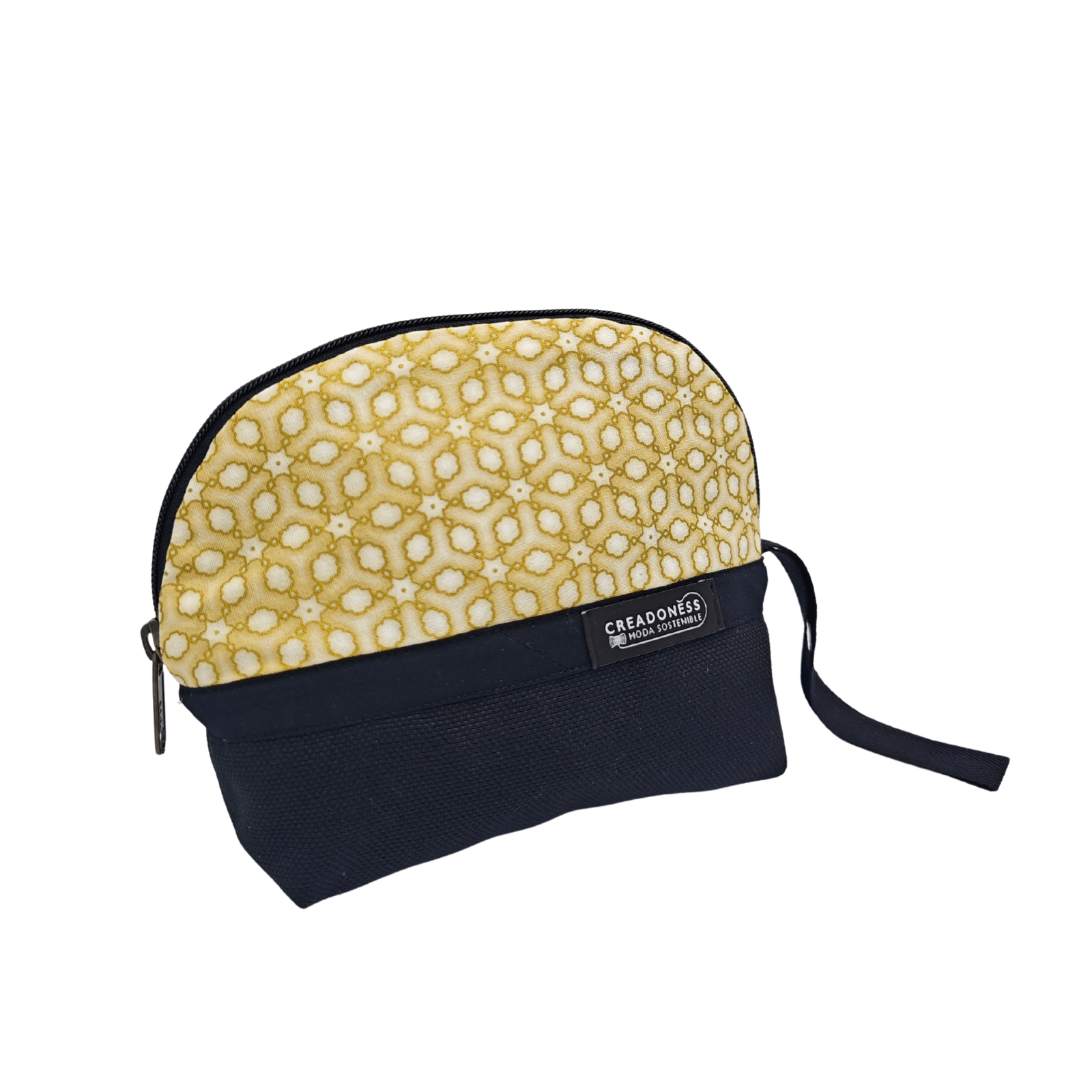 Este neceser pequeño está hecho a mano por las mujeres que nosotras formamos en el Programa Social de Creadoness. Está confeccionada con una suave loneta de algodón bicolor, con la característica de ser antimanchas. En su interior está forrado con popelín negro.