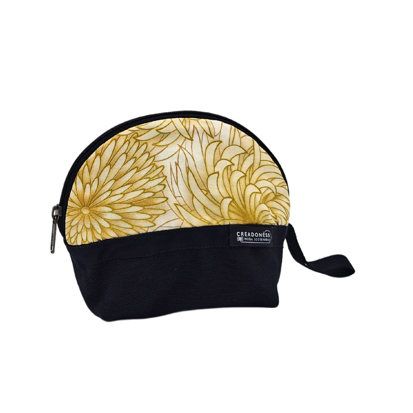 Este neceser pequeño está hecho a mano por las mujeres que nosotras formamos en el Programa Social de Creadoness. Está confeccionada con una suave loneta de algodón bicolor, con la característica de ser antimanchas. En su interior esta forrado con popelin negro.