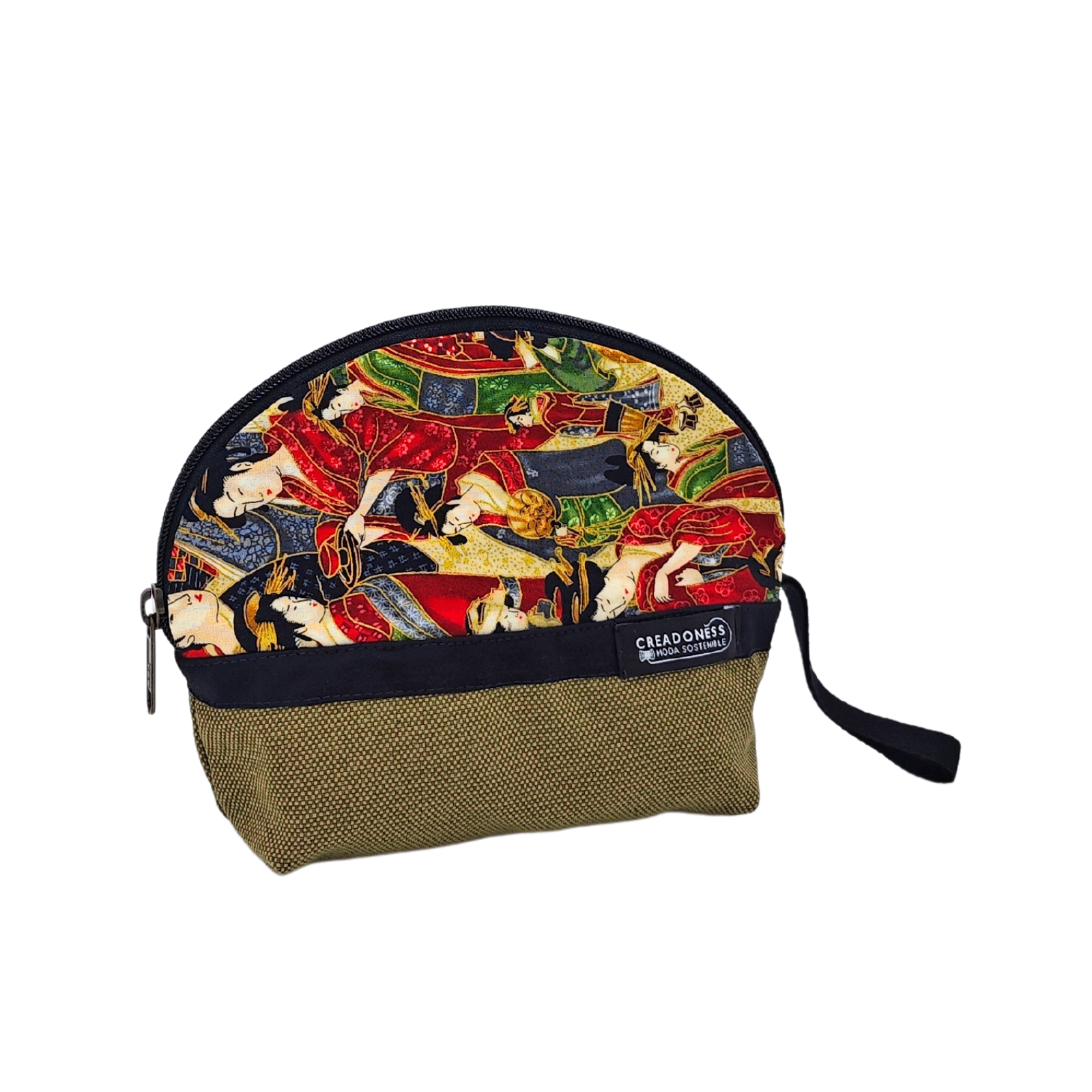 Este neceser pequeño está hecho a mano por las mujeres que nosotras formamos en el Programa Social de Creadoness. Está confeccionada con una suave loneta de algodón bicolor, con la característica de ser antimanchas. En su interior está forrado con popelín negro.