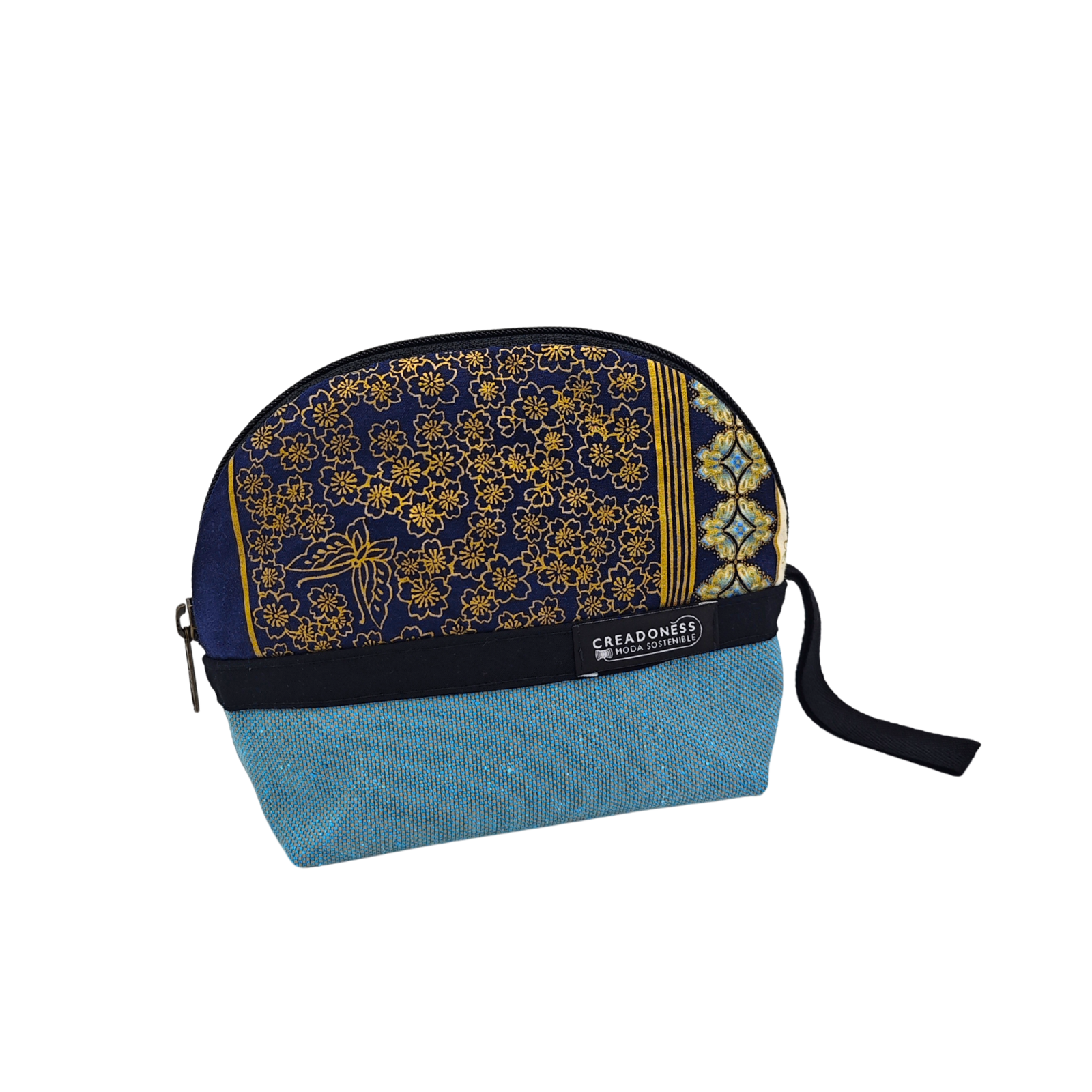 Este neceser pequeño está hecho a mano por las mujeres que nosotras formamos en el Programa Social de Creadoness. Está confeccionada con una suave loneta de algodón bicolor, con la característica de ser antimanchas. En su interior está forrado con popelín negro.