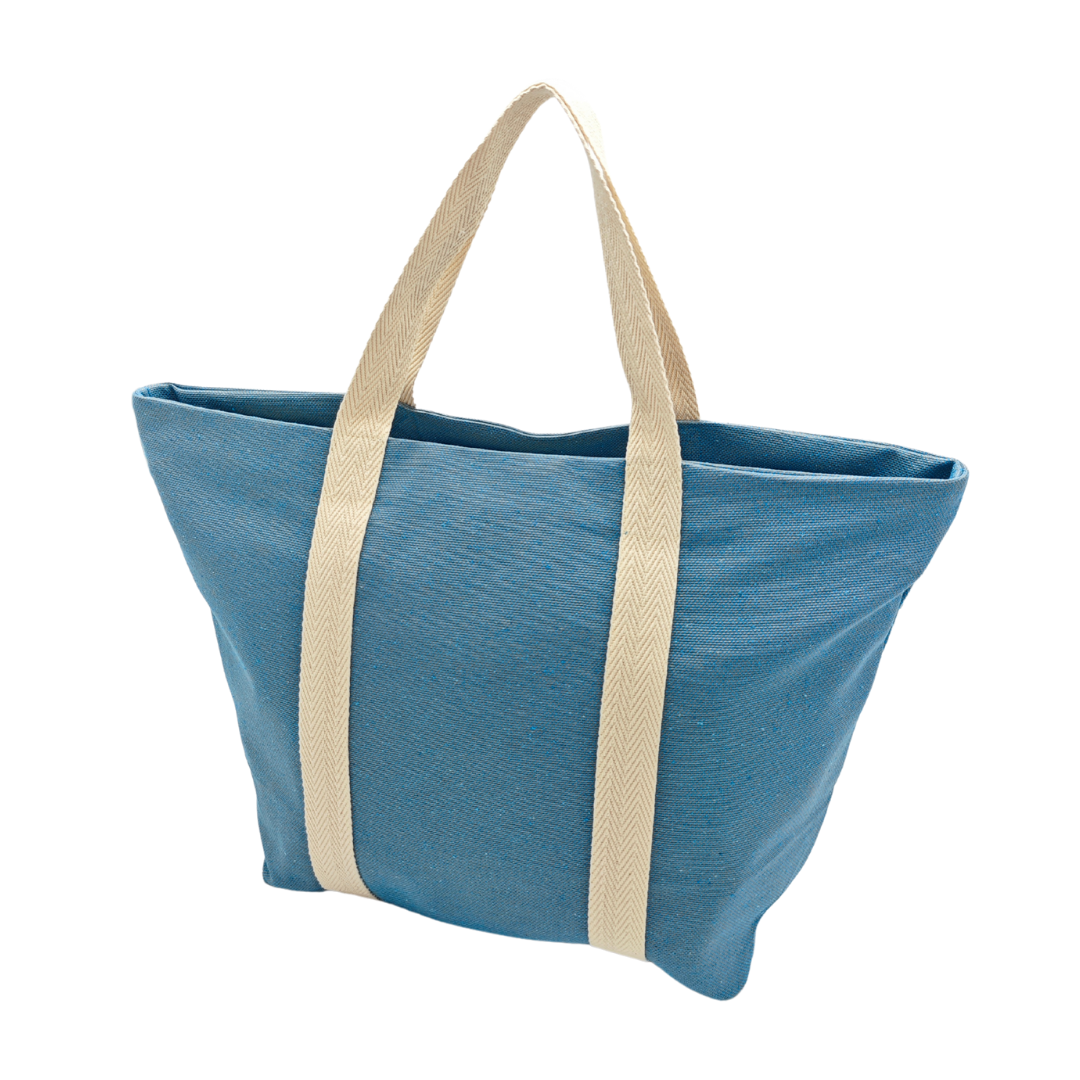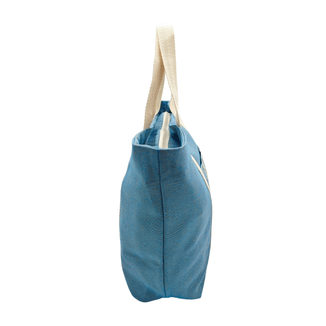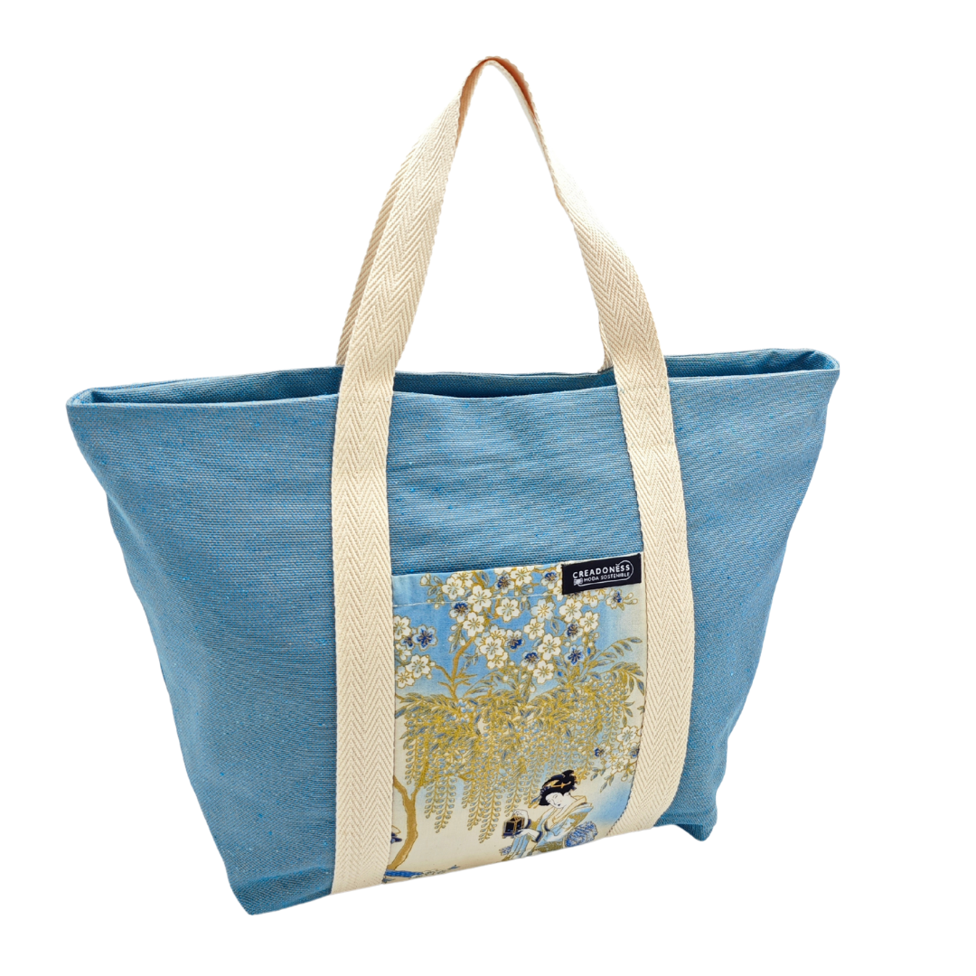 La medida es de 48 x 34 cm. Profundidad de 9 cm. Posee 2 asas de algodón de cinta de espiga de 4 cm de ancho. Bolsillo exterior 15 x 33 cm. Bolsillo interior de 20 cm de profundidad. Por su profundidad tiene una gran utilización del espacio. Por el interior está todo forrado con tela de algodón blanco. Posee cremallera. En el frente tiene otro bolsillo de 15 cm para guardar tu botella de agua.