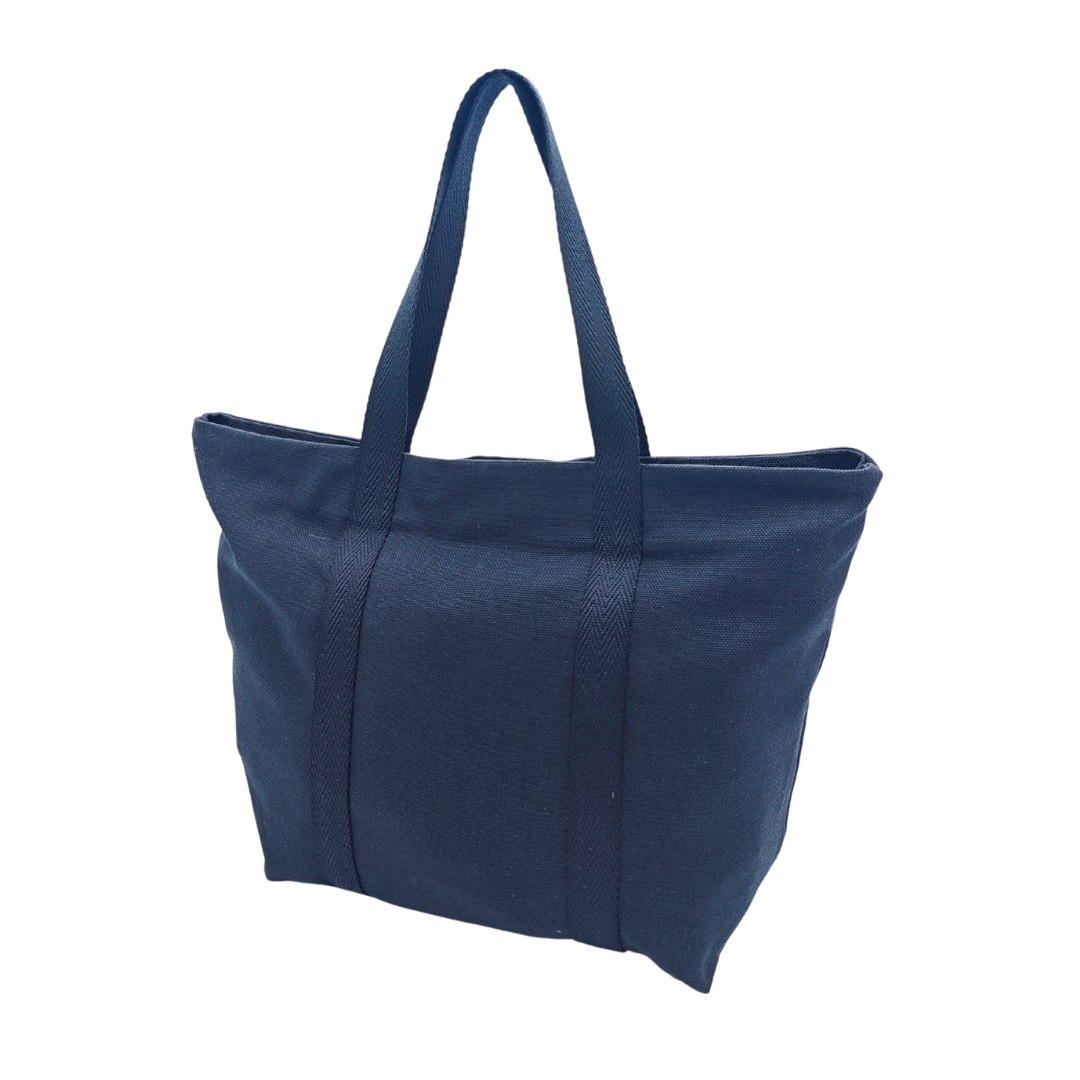 La medida es de 48 x 34 cm. Profundidad de 9 cm. Posee 2 asas de algodón de cinta de espiga de 4 cm de ancho. Bolsillo exterior 15 x 33 cm. Bolsillo interior de 20 cm de profundidad. Por su profundidad tiene una gran utilización del espacio. Por el interior está todo forrado con tela de algodón negra. Posee cremallera. En el frente tiene otro bolsillo de 15 cm para guardar tu botella de agua.