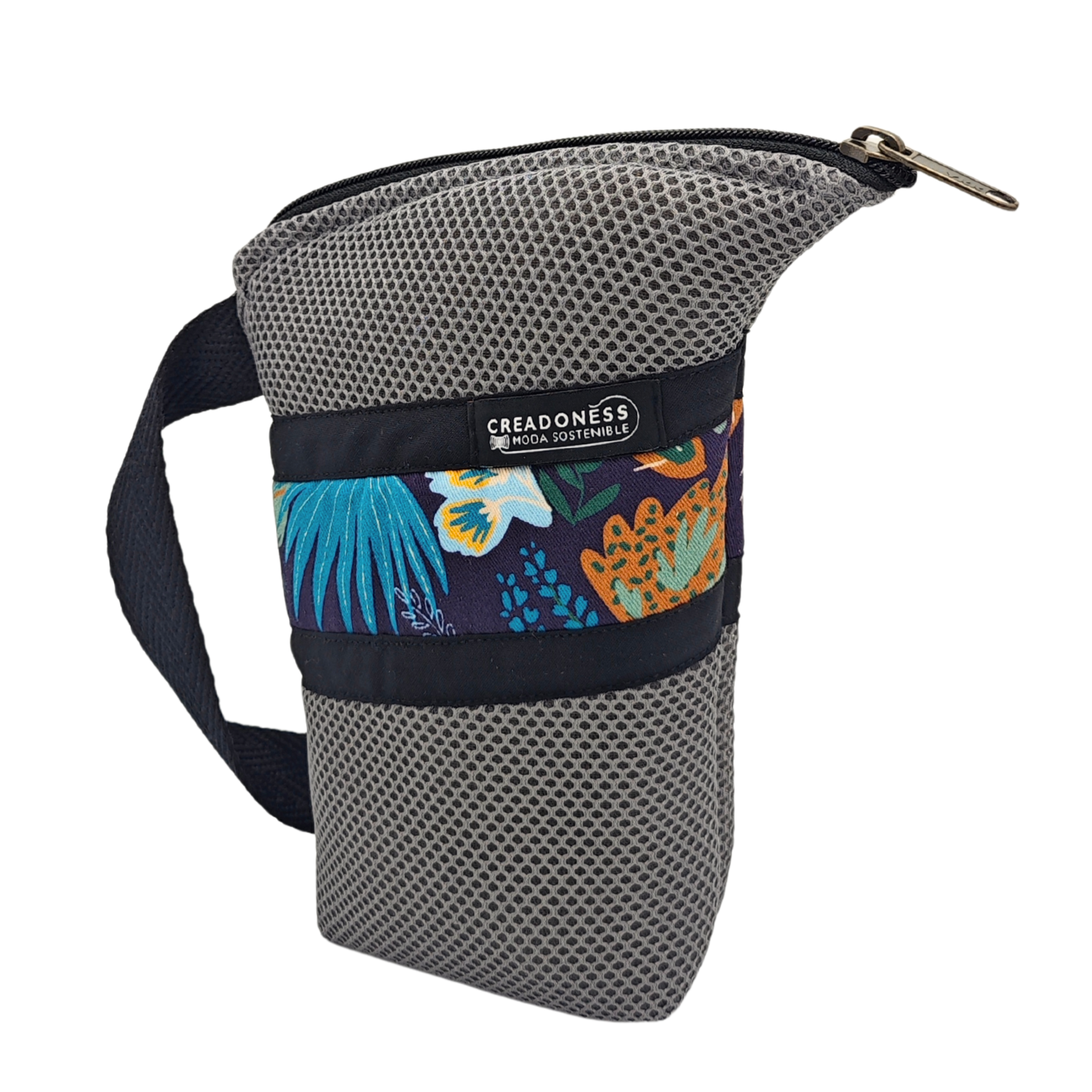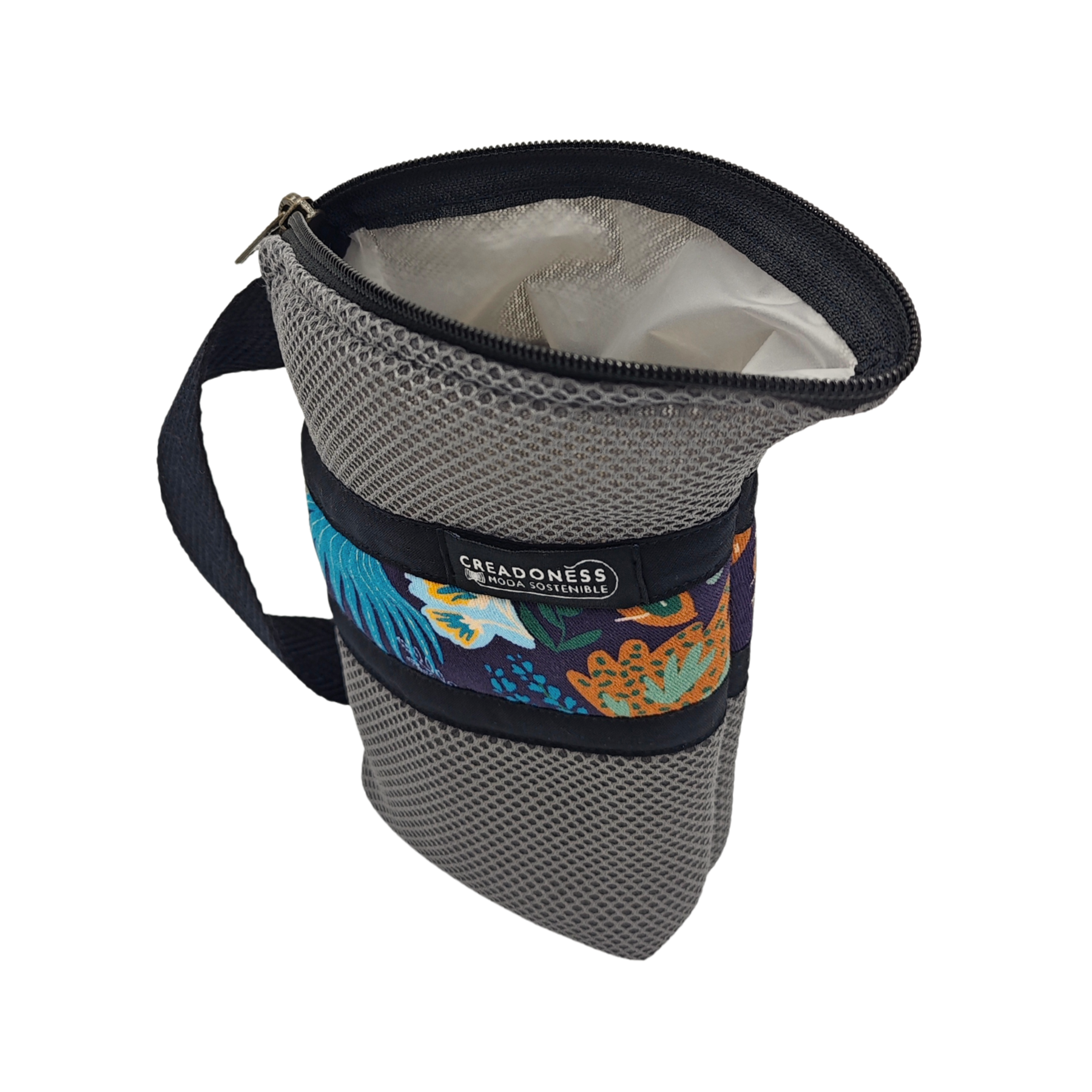 Esta Yerbera está hecha a mano en Barcelona con tejido técnico 3D. En el interior posee forro alimentario, apto para conservar alimentos secos. Es muy ligera y por su tipo de diseño posee un pico vertedor.